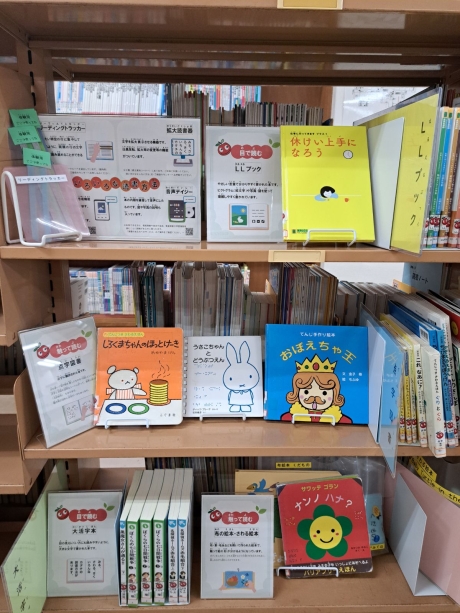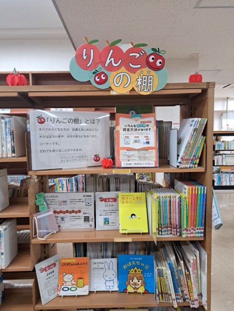 他にも読書支援コーナー、ユニバーサルコーナーなどの形で展開している図書館も増えてきていますが、「りんごの棚」がよいのは「りんご」のマークがアイコンになって目立つだけでなく楽しそうな感じがするところで、障害者向けのような枠にはめない読書コーナーという共通認識を育てます。