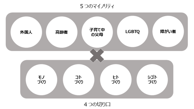 5つのマイノリティ(障がい者・LGBTQ・子育て中の父母・高齢者・外国人)を対象に、4つの切り口(シゴトづくり・ヒトづくり・コトづくり・モノづくり)からの解決を目指す。障がいの有無に関 わらず誰もが持っている“心のバリア”をクリエイティブに壊し、多様性に寛容な社会の実現をゴールに活動している。その活動のひとつに「りんごの棚」の普及などを目的とした「りんごプロジェクト」 がある。